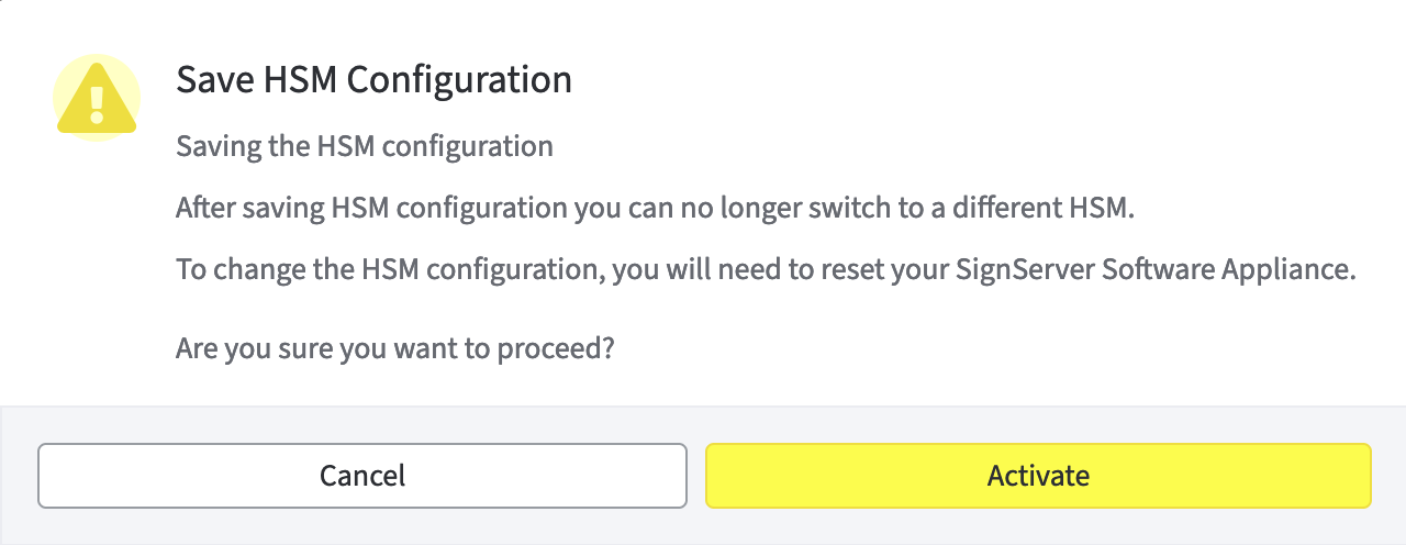 To change the HSM configuration, you need to reset your SignServer Software Appliance. Proceed by clicking Activate.