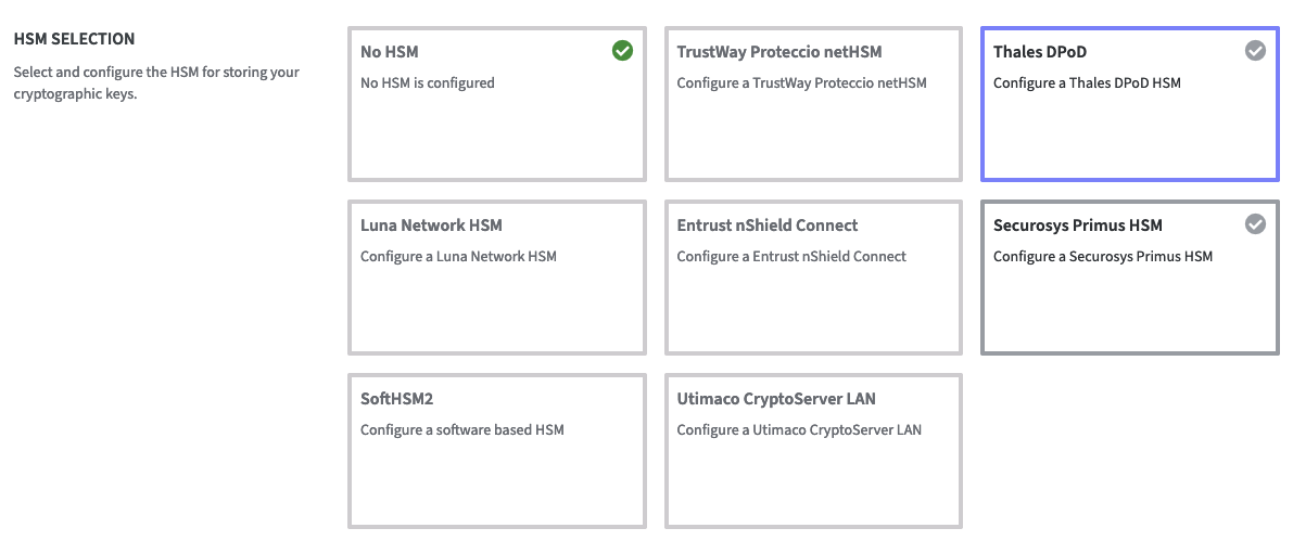 Configuring an HSM for the Software Appliance is irrevocable. To change an HSM configuration, you must reset the Software Appliance.