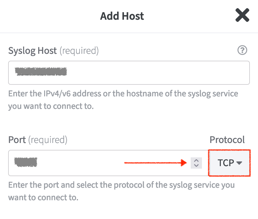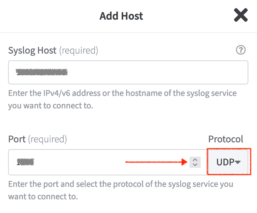 Alternatively, enter the hostname of the syslog service. - Specify the Port for the desired syslog service.
