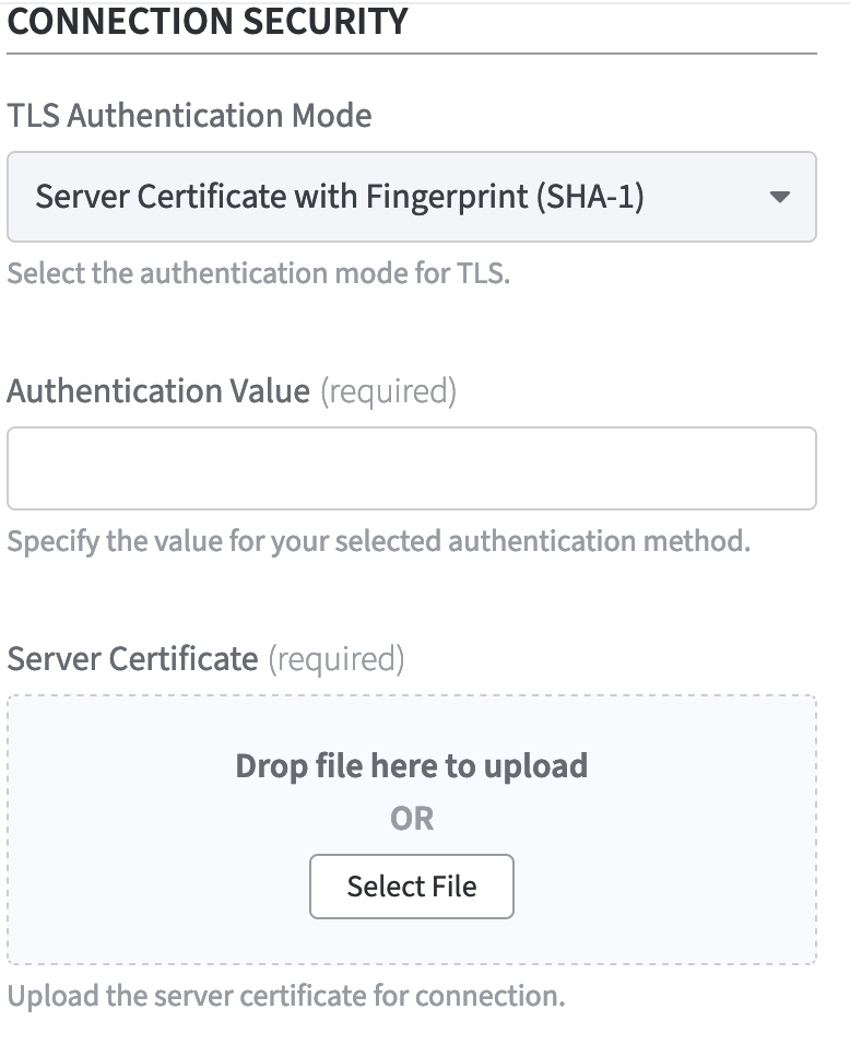 Upload the Server Certificate and enter its SHA-256 as the Authentication Value.