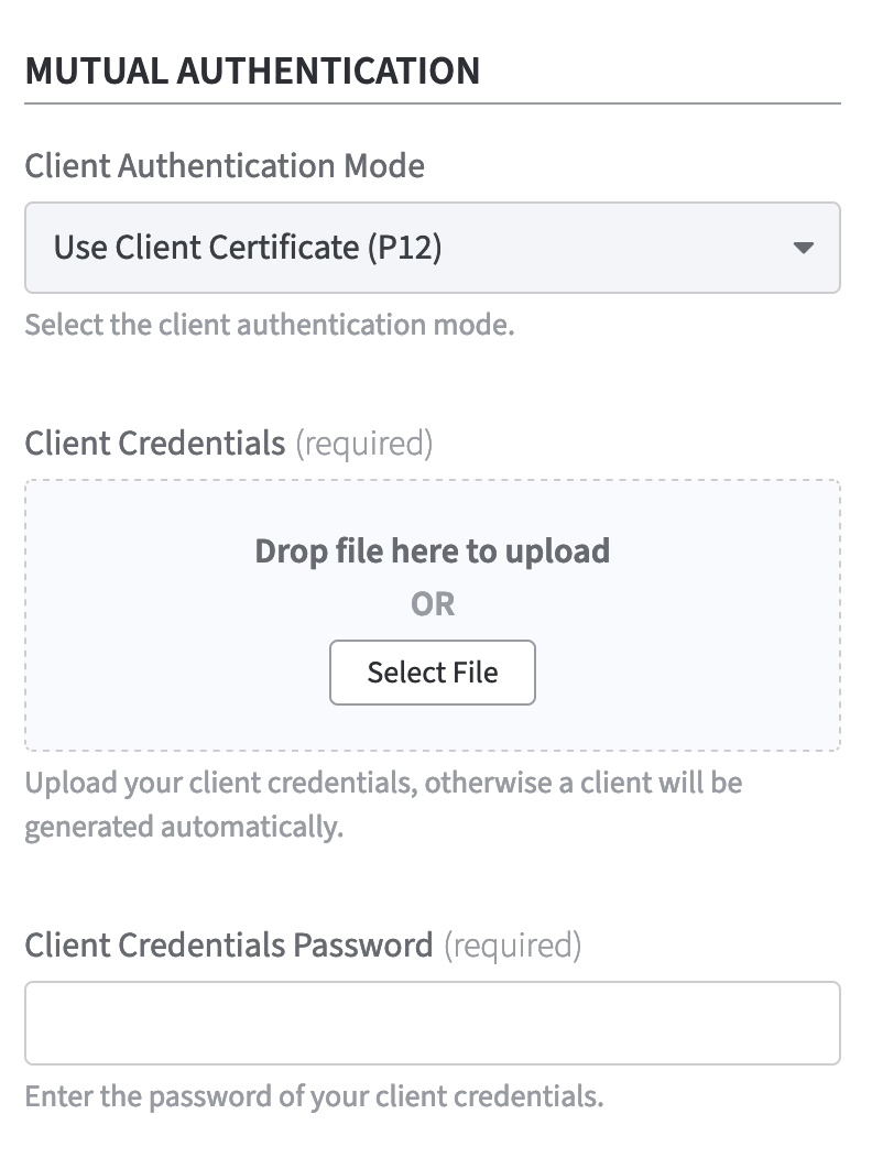 Upload the Client Certificate and the associated private key in the form of a PKCS #12 archive file. Also specify the Password to open the PKCS#12 file in the Client Credentials Password field.