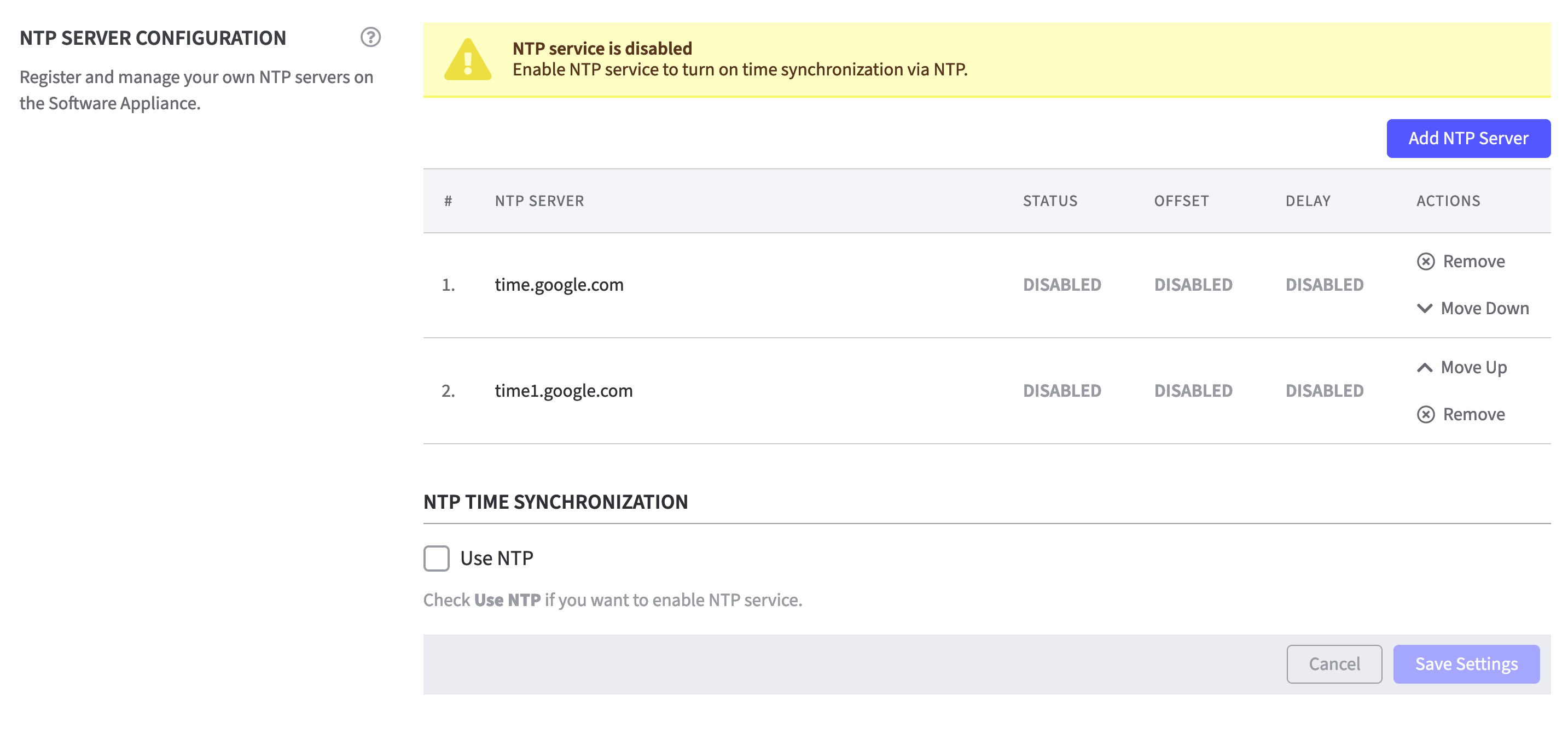 To use NTP Time Synchronization it is possible to register and manage Network Time Protocol NTP Server(s) on the Software Appliance. The first step is to configure NTP Server(s), which can then be activated for NTP Time Synchronization.