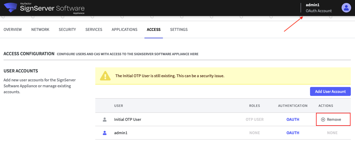 After the new User Account is added, log in again with the new User Account. Now you can delete the Initial OTP User.