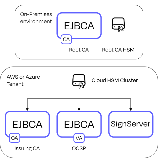 The Root and Issuing CA runs in AWS or Azure using a cloud HSM. Signing workloads in SignServer run close to cloud applications for low-latency operations.