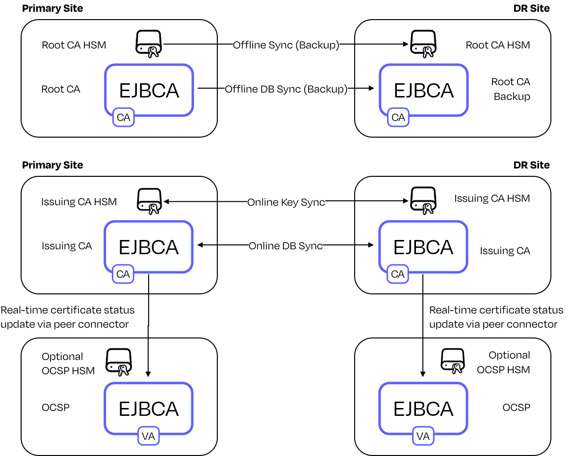 A Root CA resides on an offline HSM, with Issuing CAs and OCSP services operating online on-premises. This model is commonly used in regulated environments requiring full control over trust anchors.